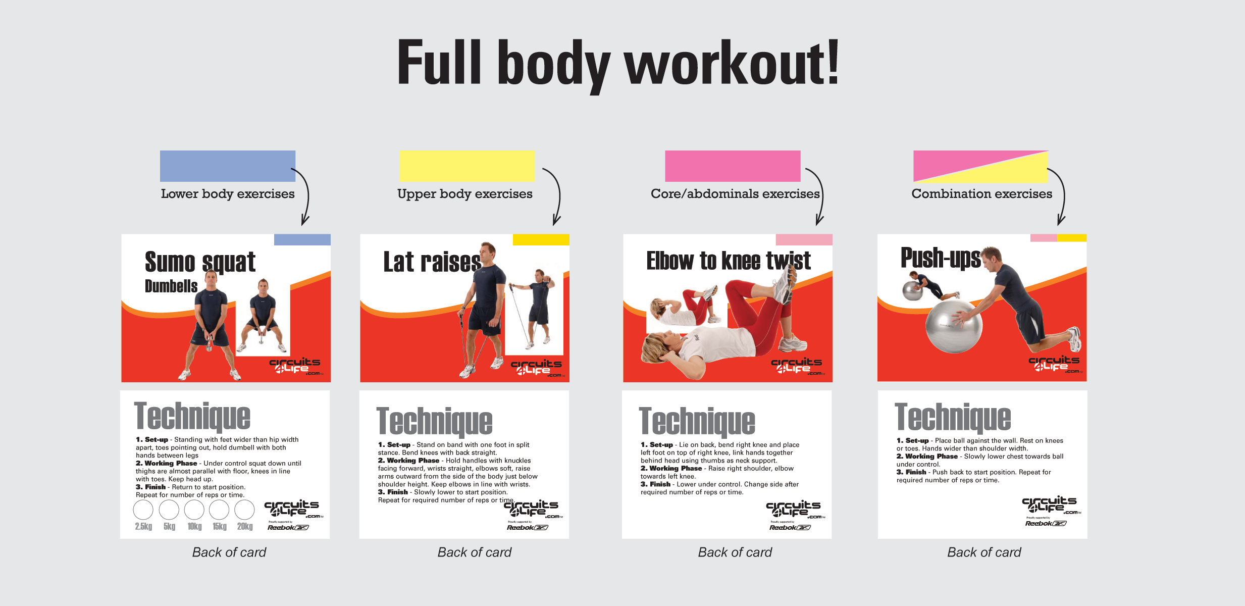 Each set includes upper and lower body and abdominal exercises